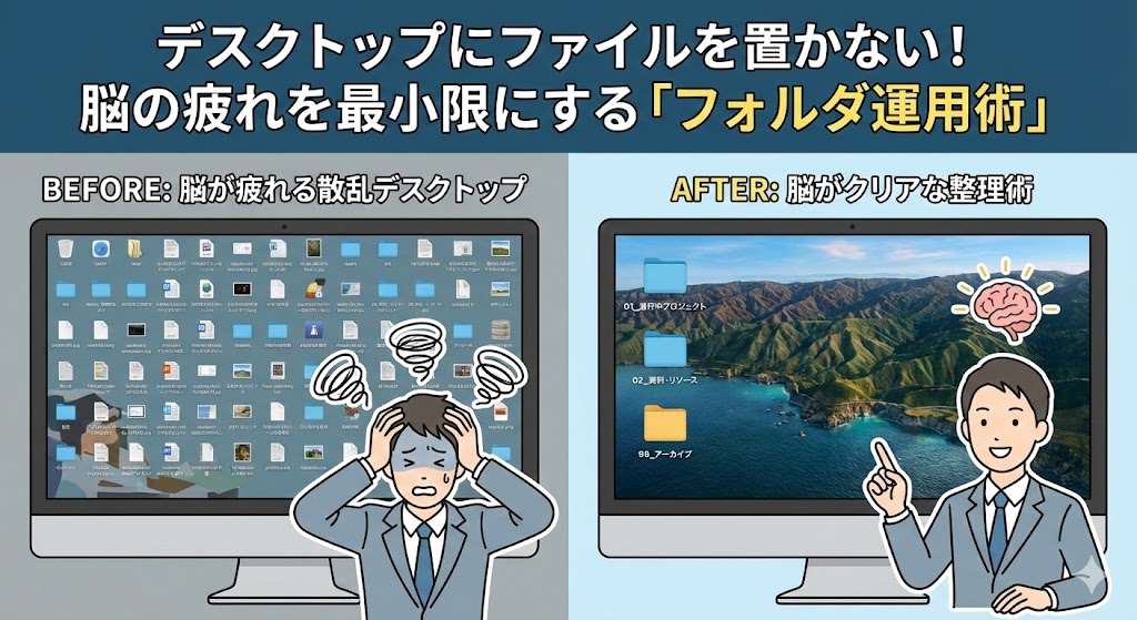 デスクトップの乱れは心の乱れにつながります。アイコンで埋め尽くされた画面は、想像以上に脳のエネルギーを消費し、集中力を削いでいるのです。