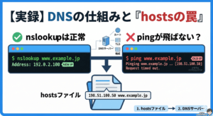 nslookup: OSのロジックを無視して、直接DNSサーバーに正解を訊ねるコマンドです。だから「サーバー上の正しい新IP」を返しました。ping やアプリ: 標準的なOSのルールに従います。DNSよりも優先される hosts ファイルの内容を「絶対的な正義」として信じ込んでいたのです。インフラエンジニアとして、同じ罠にハマらないための「調査の型」を伝授します。
