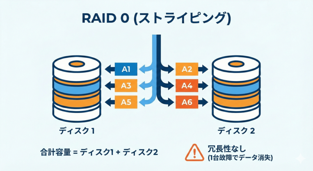 RAID 0(ストライピング):速度特化、ただし耐障害性はゼロ