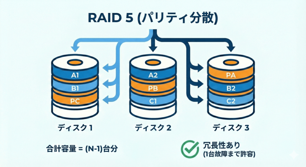 - 仕組み:RAID 5は、データ本体と同時に、障害発生時にデータを復元するためのパリティと呼ばれる誤り訂正符号を生成し、それらを3台以上のディスクに分散して記録します。