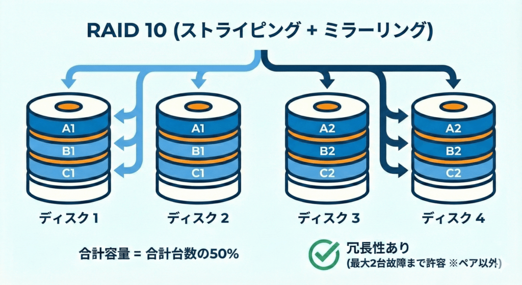- 仕組み:RAID 10は、RAID 1(ミラーリング)とRAID 0(ストライピング)を組み合わせた構成です。最低4台のディスクが必要です。まず2台ずつペアにしてRAID 1を作成し、そのミラーペアをRAID 0で繋ぎます。