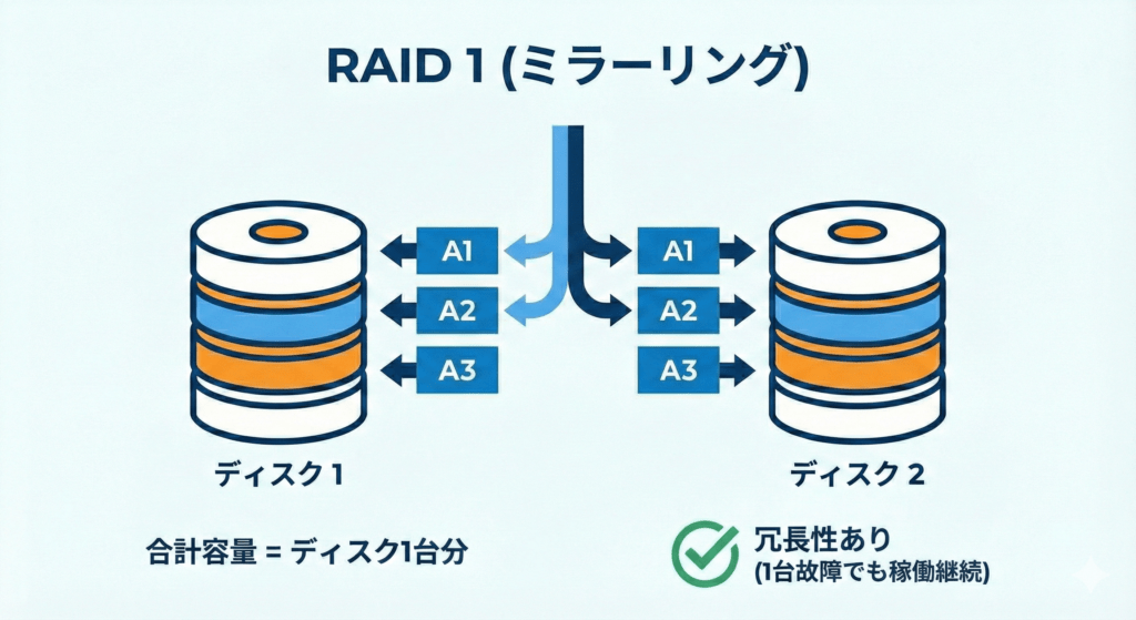 - 仕組み:RAID 1は、2台のディスクに全く同じデータを同時に書き込みます。鏡に映すようにデータを複製するためミラーリングと呼ばれます。