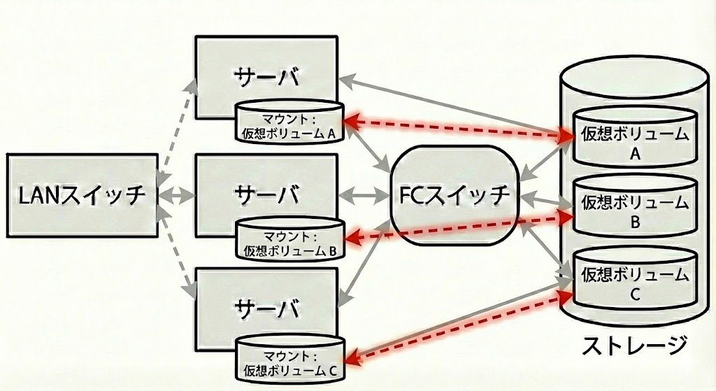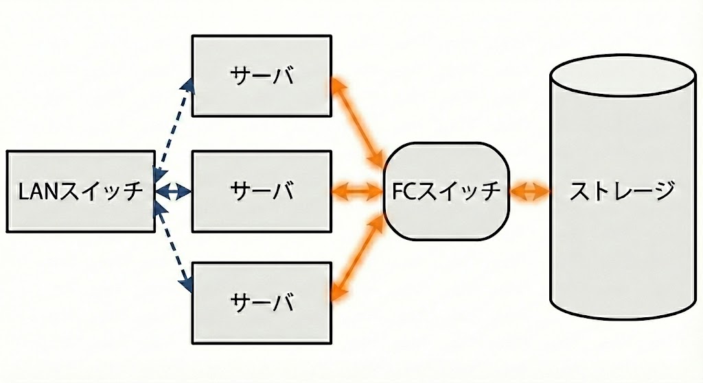 この二つを結ぶのは、一般的なLANケーブルではなく、主に光ファイバーを使った FC(ファイバチャネル) という専用の線です。 「ストレージ専用の高速道路」を通ることで、大量のデータを遅延なくやり取りできます。
