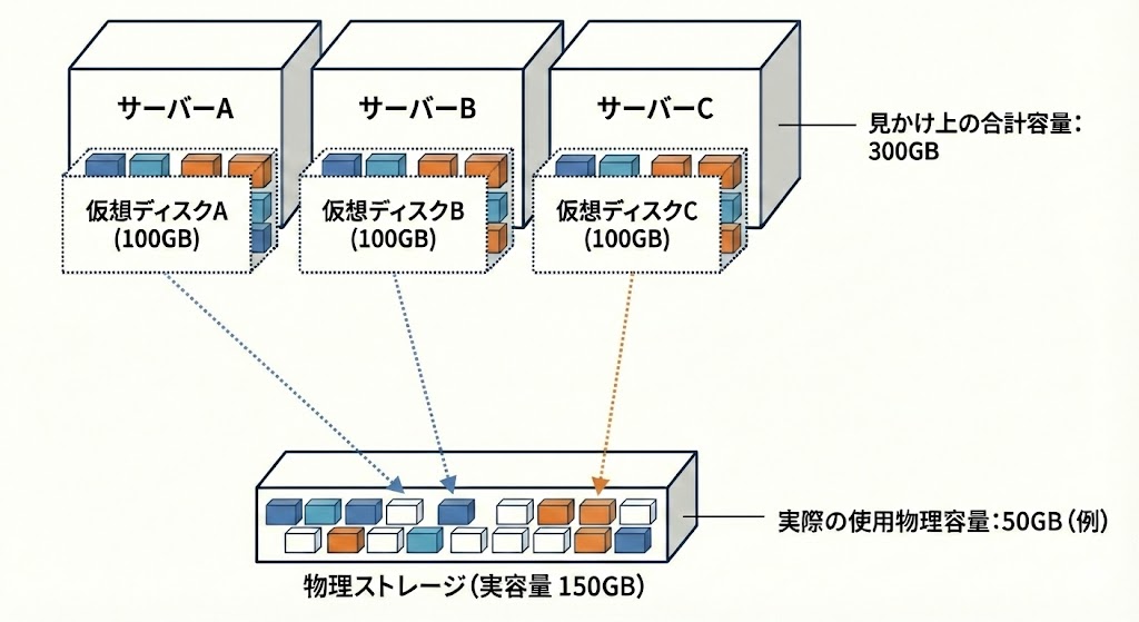 • メリット: サーバー側が「100GBある!」と喜んでいても、実際にデータが書き込まれた分(例:50GB)しか物理ディスクを消費しません。
