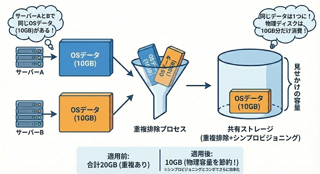 • 仕組み: 例えば、サーバーAとサーバーBに全く同じ10GBのOSデータがあったとします。通常なら20GBの物理ディスクを消費しますが、重複排除を使えば「これ、中身が同じだね!」と検知し、物理ディスクには10GB分(1つ分)しか書き込みません。